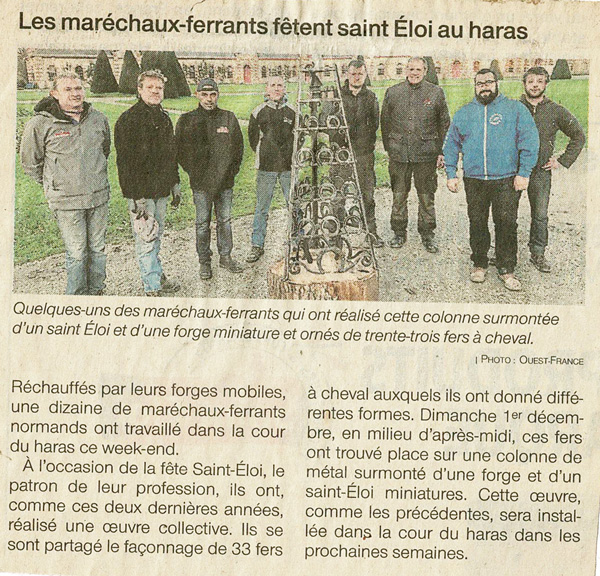 Formée à l’école de Saint-Hilaire-du-Harcouët, en alternance au Haras national de Saint-Lô, j’ai obtenu le BEPA Maréchal-ferrant Forgeron. Depuis huit ans, je participe à une œuvre collective à l’occasion de la Saint Éloi, saint patron des forgerons, au Haras national — lieu emblématique de ma formation et de transmission. Chaque année, les maréchaux-ferrants s’y réunissent pour créer autour du fer à cheval, symbole fort de notre métier. Le public est invité à découvrir les gestes précis, les outils traditionnels et les récits qui font vivre ce savoir-faire ancestral. Cet événement incarne une tradition vivante, fondée sur la solidarité, la rigueur et la créativité. Il révèle la richesse d’un métier en constante évolution, au croisement de l’artisanat, du patrimoine et de l’innovation.